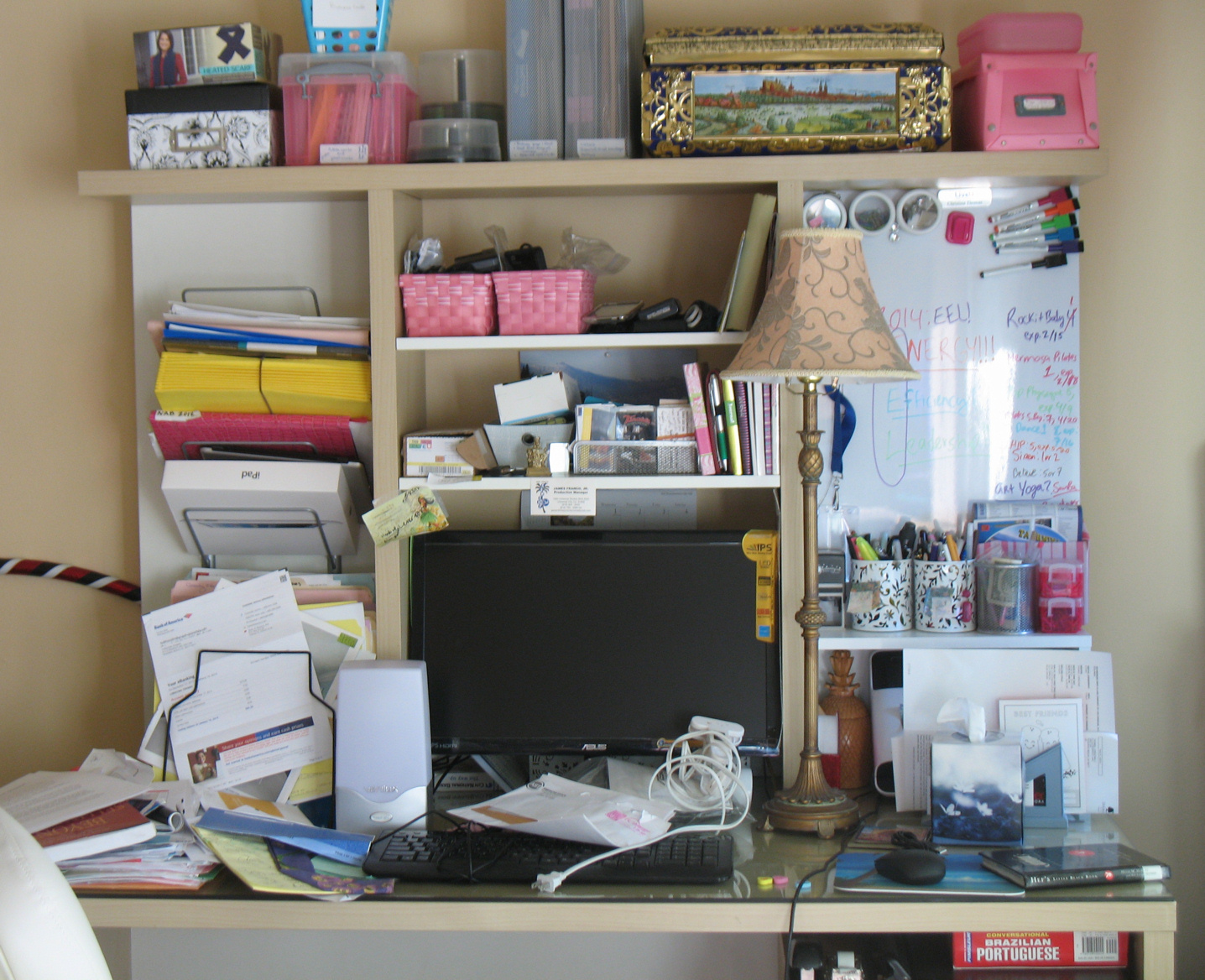 This office space is in the living room. My client wanted her office area to look serene so that it complemented the living room area. Some of the clutter was too many organizing containers. She decided which containers she wanted to go back into the space we populated the containers with the supplies. Extra supplies went into a container on the shelf.