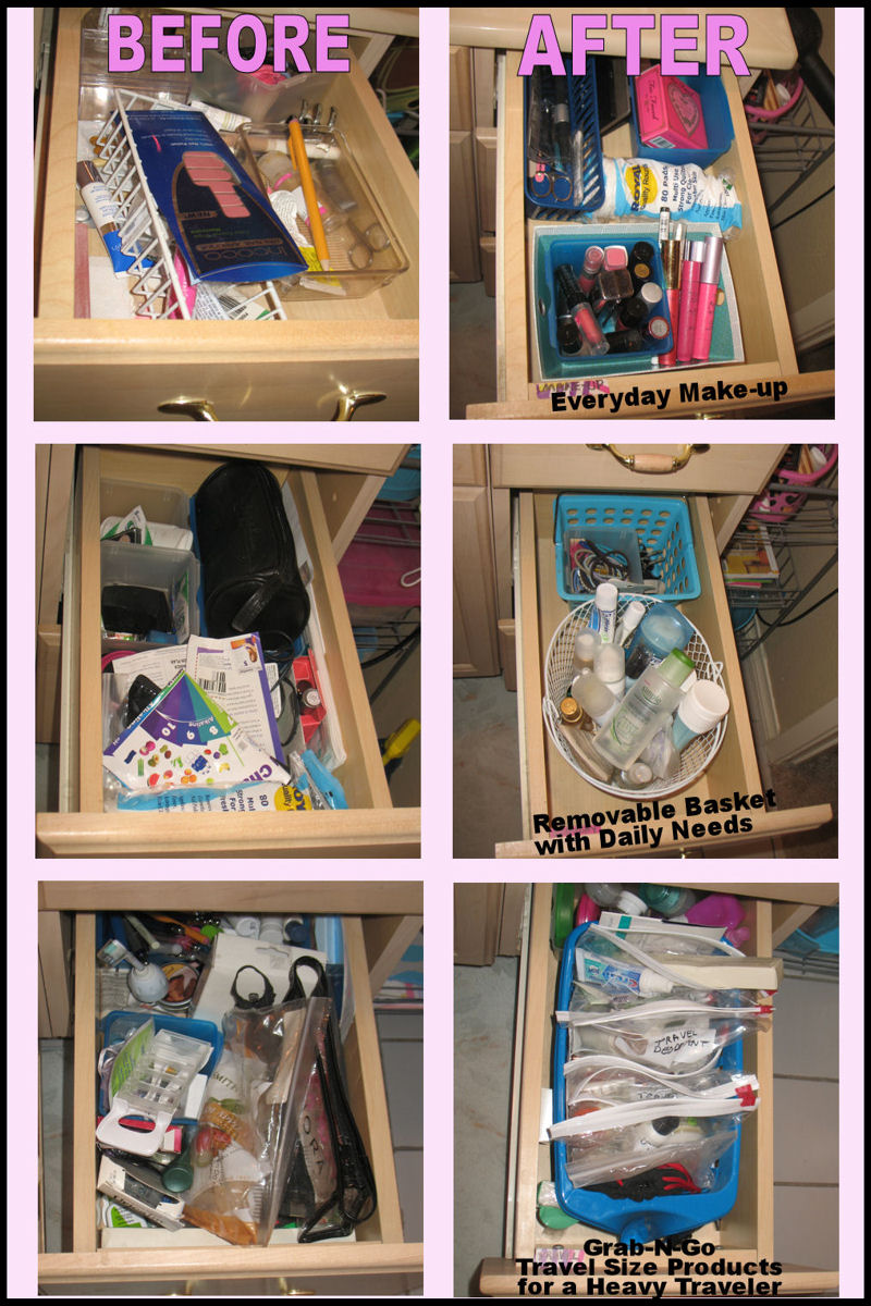 My client travels frequently. She has lots of travel size products. We labeled baggies and sorted her travel products by purpose: Shampoo, Conditioner, Toothpaste, Lotions, etc. We put the baggies in a handled basket so it can be lifted out and easily replaced into the drawer. This will allow her to easily find what she needs when she is replenishing her travel bag.