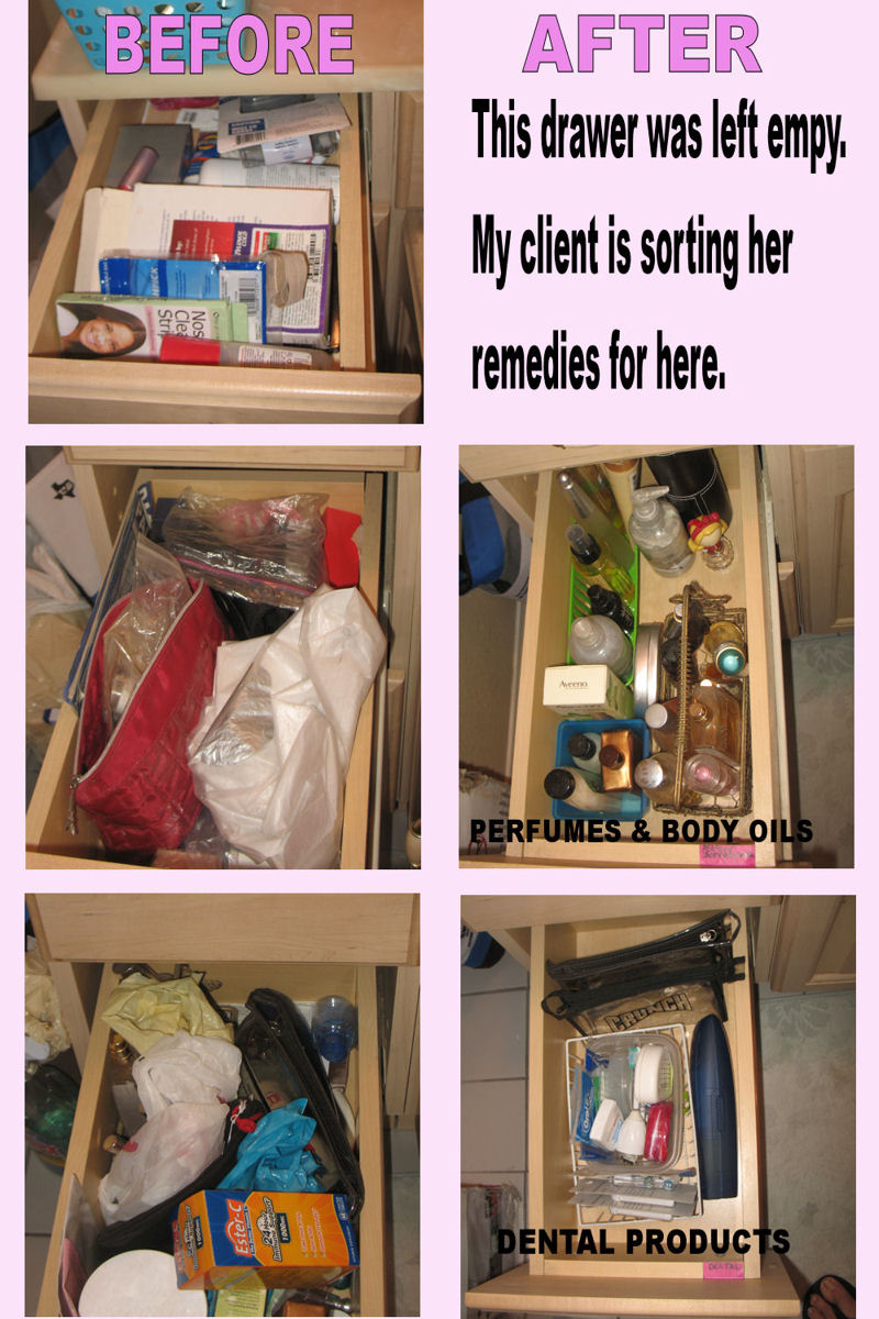 Counter top items were in containers but my client wanted less clutter. Everyday self care items were put in a handled basket right into a drawer for easy access and easy retrieval.