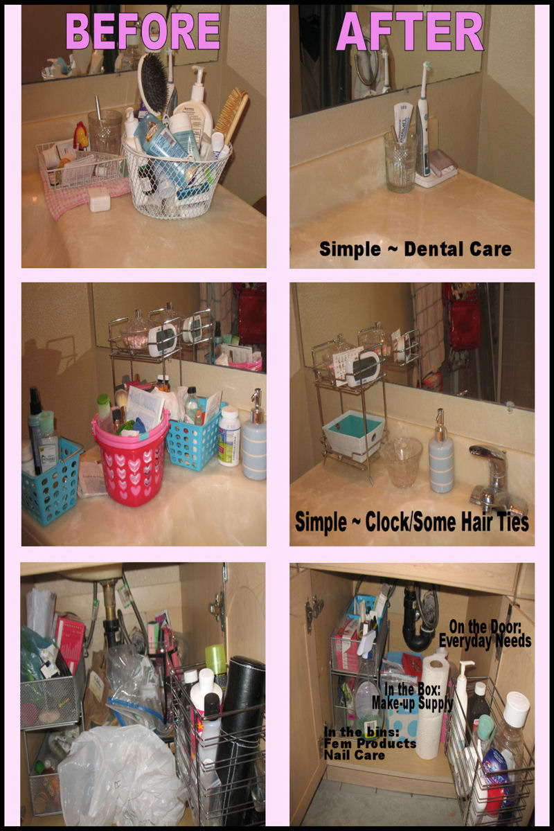 Under the cabinet there was a two tier basket holder that now has a purpose for each drawer. On the door, we put tall daily use products for quick access and use. The big blue container in the middle has face products and make-up supplies in labeled baggies according to purpose such as: Eyes, Blush, Foundation, Eye and Face Cream, etc.