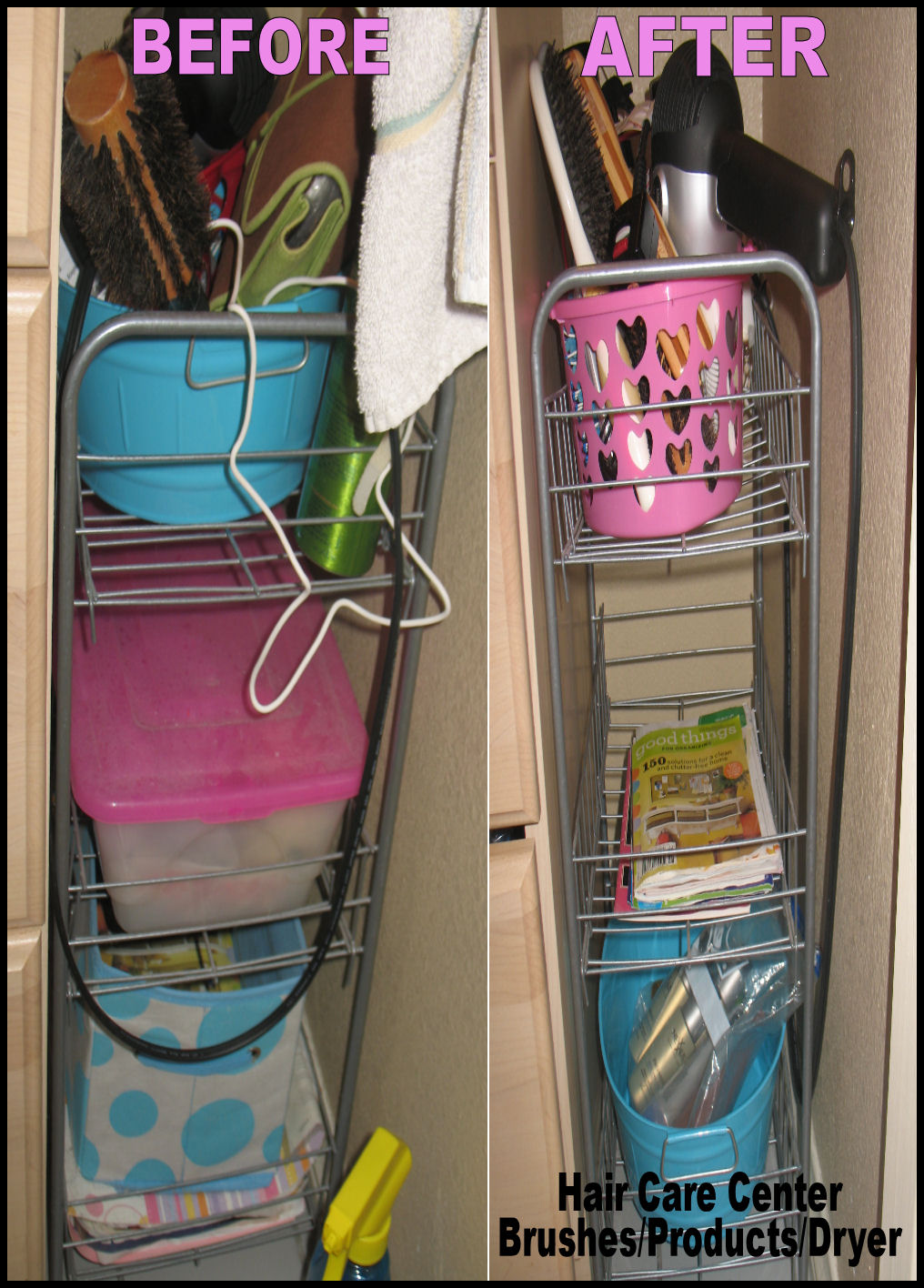 This three tiered unit was used for general purpose but it did have a basket with a hair brush and a hair dryer in it. I stayed with that theme and put all hair care products here to create a Hair Care Station. The pink basket has hair brushes and the hair dryer, behind are sprays and gels.